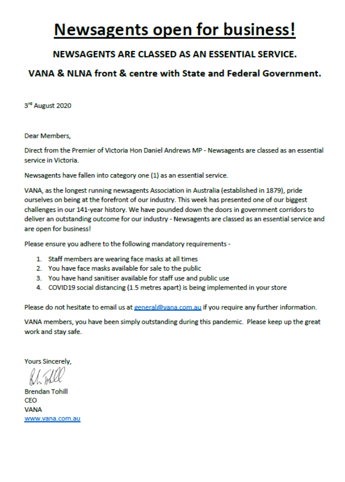 - Newsagents are an essential service during stage 4 COVID19 restrictions.